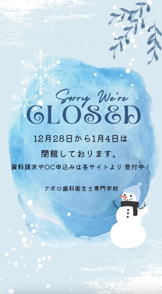 2023年12月28日から2024年1月4日までの間、アポロ歯科衛生士専門学校は閉館しております。
